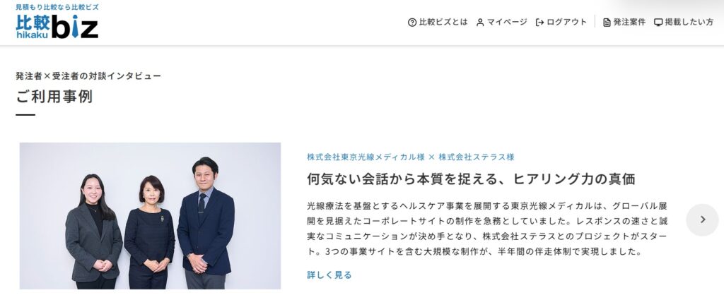 本記事では、比較ビズ様を通じて出会ったステラス社様とともに、弊社コーポレートサイトのリニューアルに至った経緯や、実際に比較ビズを利用して感じたメリットについて対談形式で紹介されています。